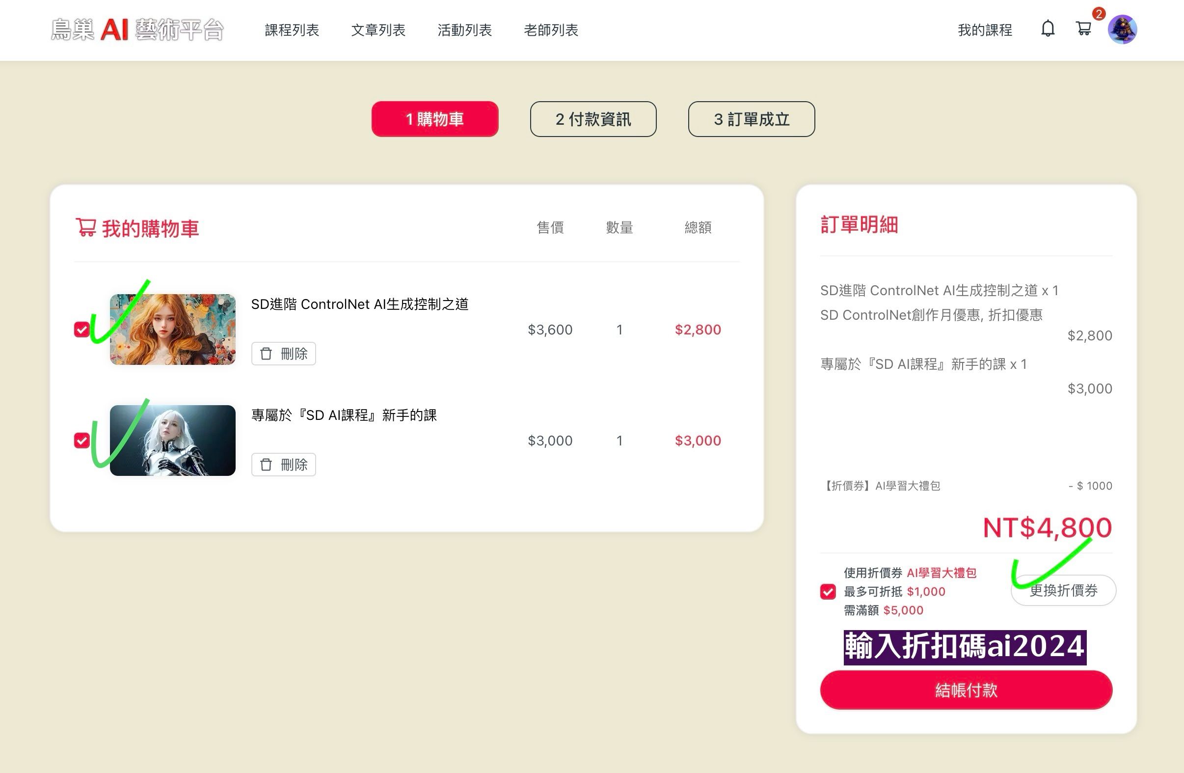 https://www.aiarttw.com/courses 購物車結帳輸入折扣碼 ai2024