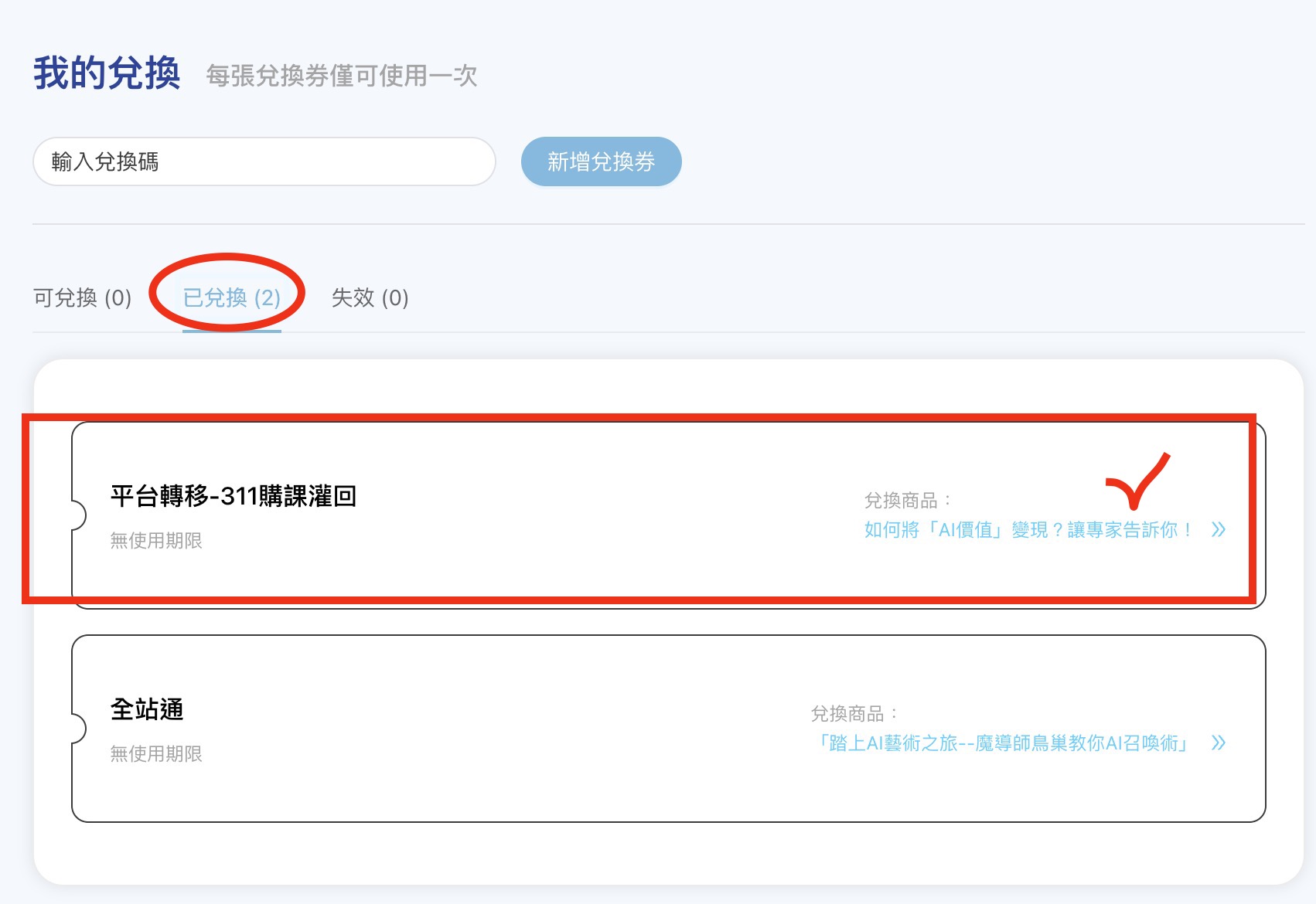 兌換券 兌課方式2023-03-09鳥巢本平台的兌換券 兌課方式 點選右上角個人帳號,有跳出式選單,選擇『我的兌換』 找到 已兌換,點選後跳出可以兌換的 課程名稱,再點選 右邊會有活動倒數時間,上課當天 提早十分鐘 開放進入 #購課須知