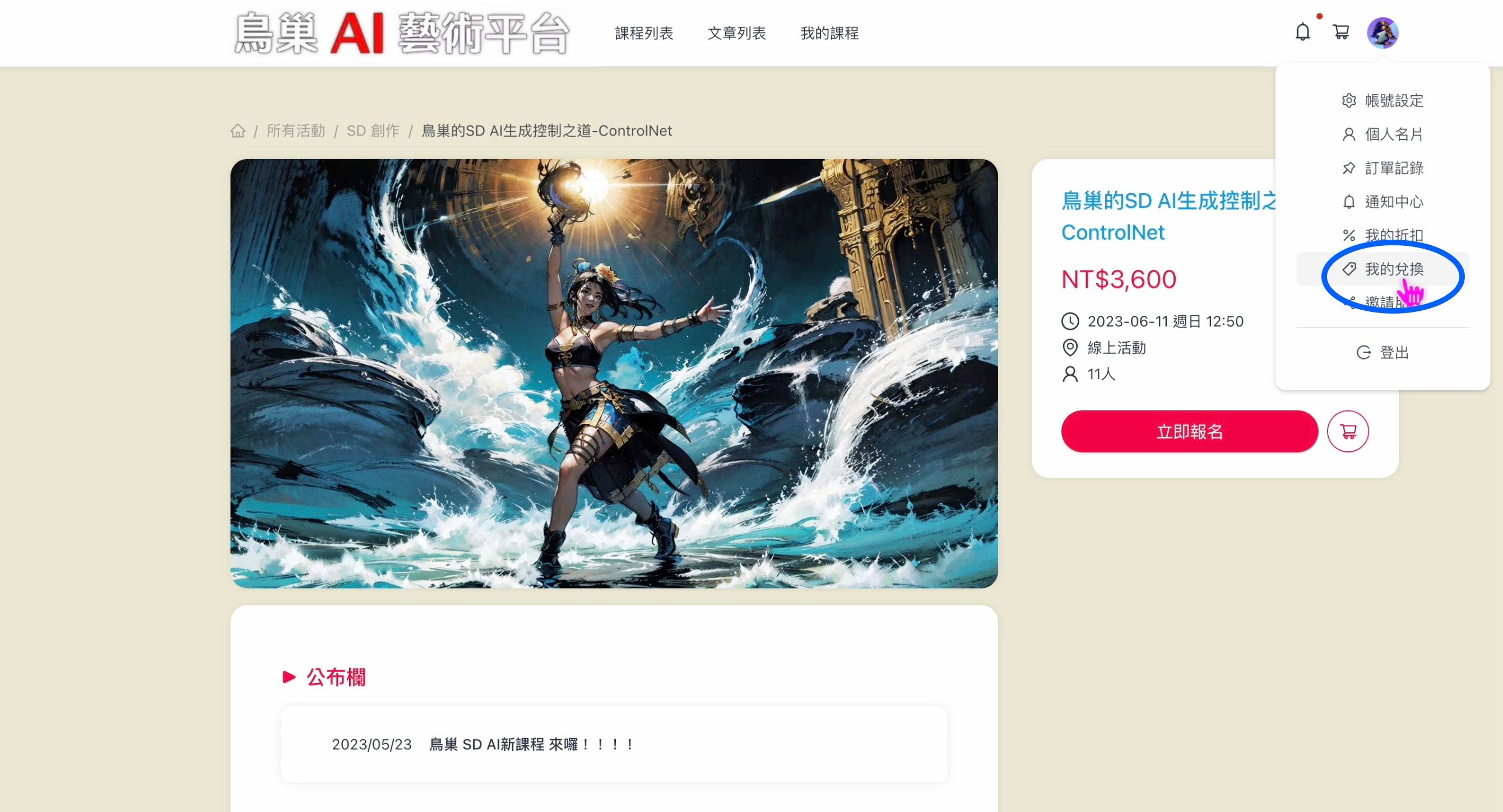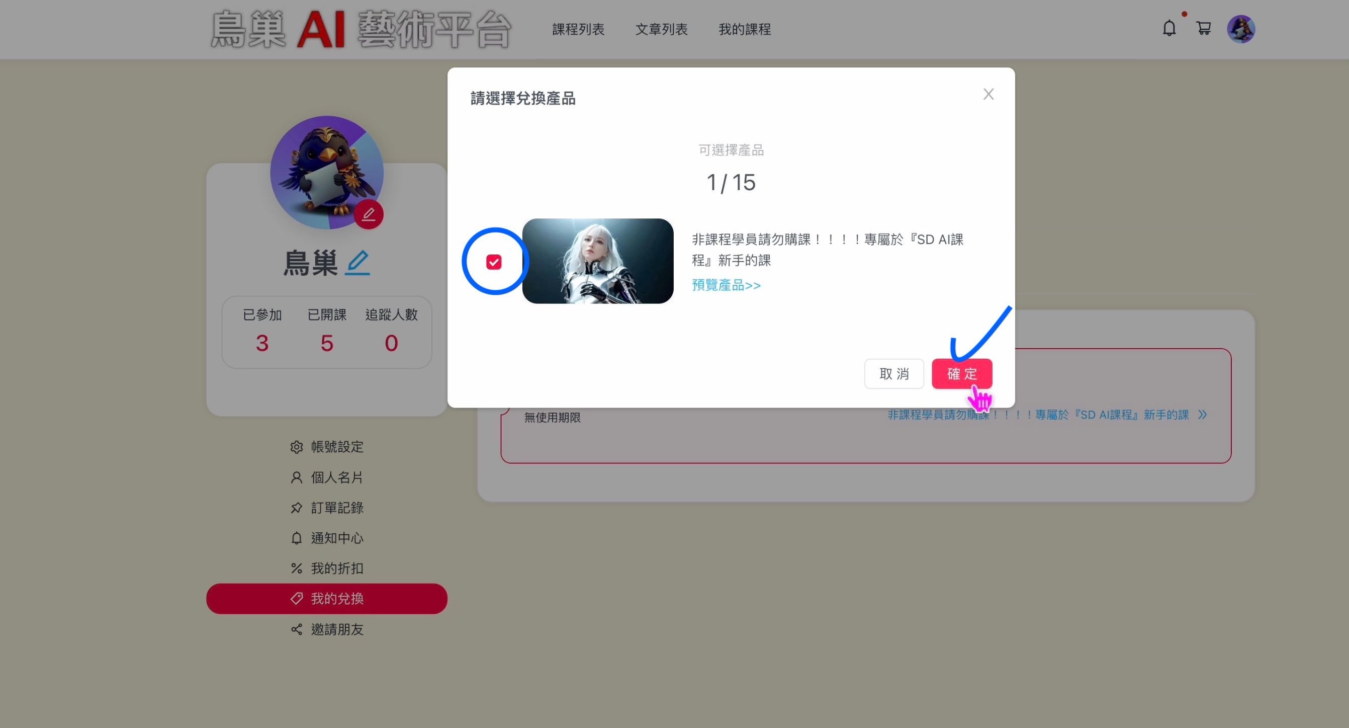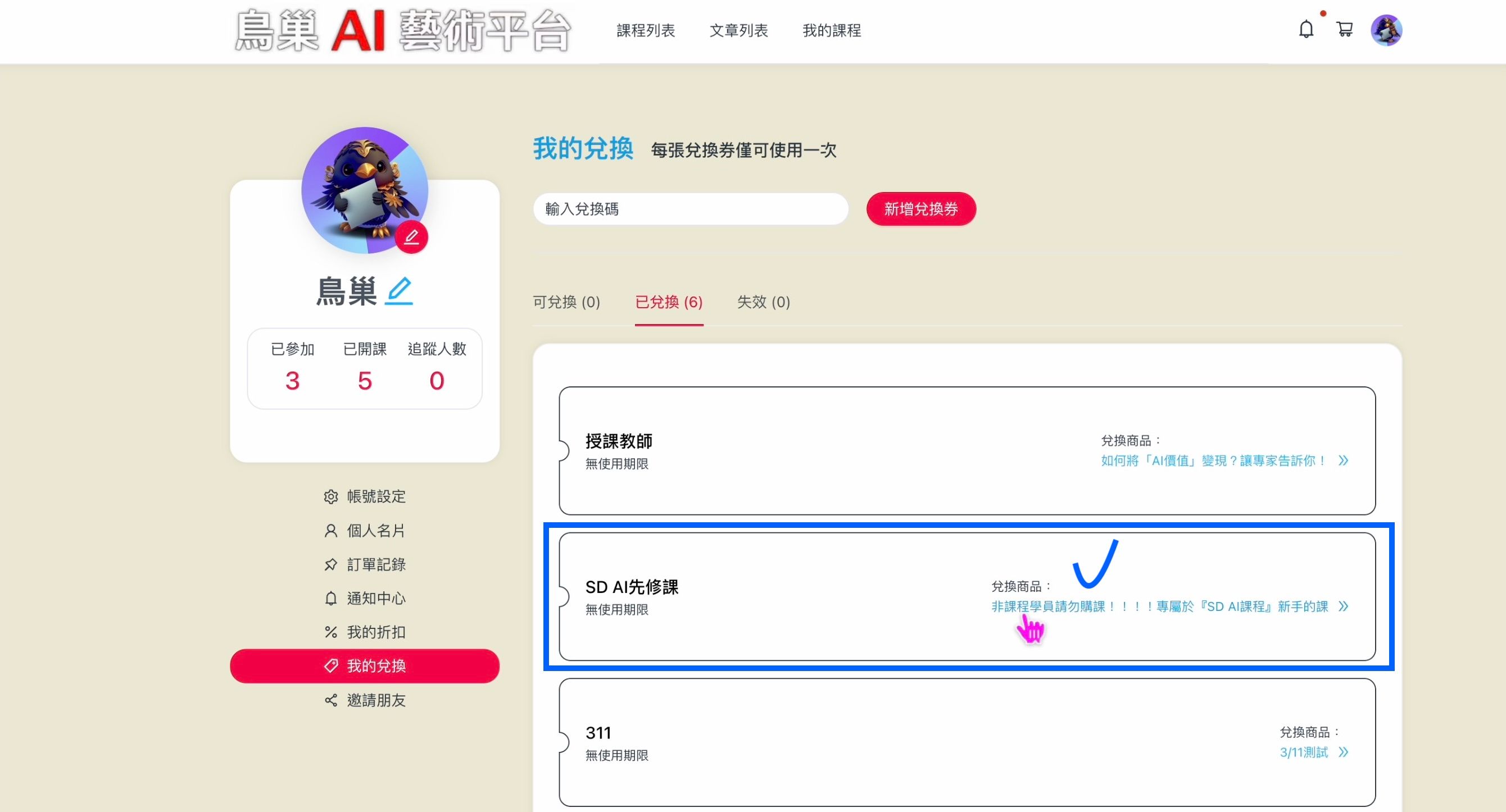 須知課程兌換須知-步驟流程2023-06-07鳥巢課程兌換須知-步驟流程 兌換流程: 1.打開帳號選單,選擇<我的兌換> 2.選擇兌換項目之後,按下確定。 3.兌換成功!點選該課程名稱~ 4.注意!請重新載入頁面 Reload!!! 5.選擇已經釋出的課程,播放,上課囉! 教學影片 PausePlay0:00-0:00UnmuteMuteDisable captionsEnable captionsSettingsAudioDefaultCaptionsDisabledDisabledQualityAutoAutoSpeedNormal0.25x0.5x0.75xNormal1.25x1.5x1.75x2xExit FullscreenEnter Fullscreen #購課須知